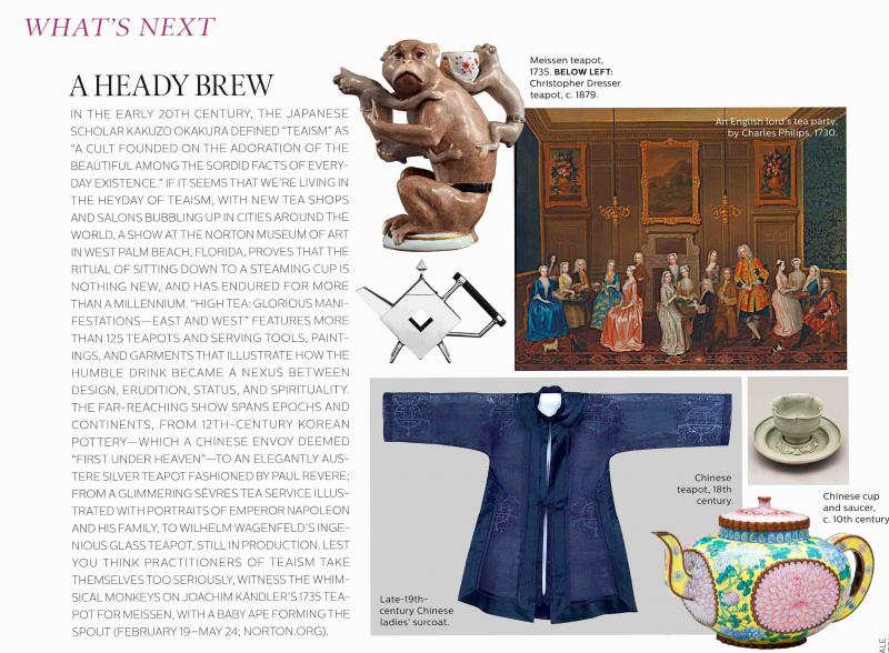 In the early 20th century, the Japanese scholar Kakuzo Okakura defined "Teaism" as "a cult founded on the adoration of the beautiful among the sordid facts of everyday existence". If it seems that we're living in the heyday of teaism. With new tea shops an salons bubbling up in cities around the world, a show at the Norton Museum of Art in West Palm Beach, Florida, proves that the ritual of sitting down to a steaming cup is nothing new, and has endured for more than amillennium. "High Tea: Glorious Manifestations - East and West" features more than 125 teapots and serving tools, paintings, and garments that illustrate how the humbe drink became a nexus between design, erudition, status, and spirituality. The far-reaching show spans epochs and continents, from 12th-century Korean pottery - which a Chinese enviy deemed "first under Heaven" - to a elegantly austere silver teapot fashioned by Paul Revere; from a glimmering sevres tea service illustrated with portraits of Emperor Napoleon and his family, to wilhelm Wagenfeld's ingenious glass teapot, still in production. Lest you think practitioners of teaism take themselves too seriously, witness the whimsical monkeys on Joachim Kandler's 1735 teapot for meissen, with a baby ape forming the spout (February 19 - May 24; Norton. org).